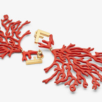 Coral-shaped earrings with FF logo and pin closure. Made of metal with a gold finish. Red enameled details. Made in Italy Composition: 100% brass Product Code: 8AL027TL9F1SD1 Product Care: The product you have purchased may be embellished with a precious metal top or varnish and may also feature appliques, gemstones (in various shades of the same color), crystals, plexiglass or resin. The mixture of materials and the special details give this product its unique character. To best maintain the product’s appearance over time, avoid contact with sea water, spa water, lacquers, perfumes, solvents, chemicals and abrasive materials. If necessary, clean with water and a neutral soap and/or polish with a dry microfiber cloth.