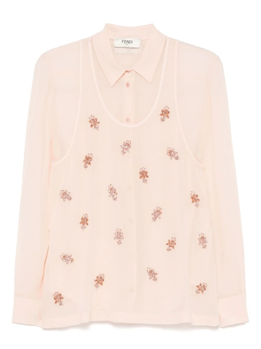 embroidered georgette shirt Highlights - Peach pink - Front button fastening - Buttoned cuffs - Removable lining - Long sleeves Made in Italy Composition Silk 100% SIZE & FIT Model measurements Height 5 ft 10 in(1.78 m) Bust/Chest 33.46 in(85 cm) Hips 36.22 in(92 cm) Waist 23.22 in(59 cm) FittingInformation Designed for a relaxed fit, this piece allows for comfort and movement when worn Made from a lightweight non-stretch fabric
