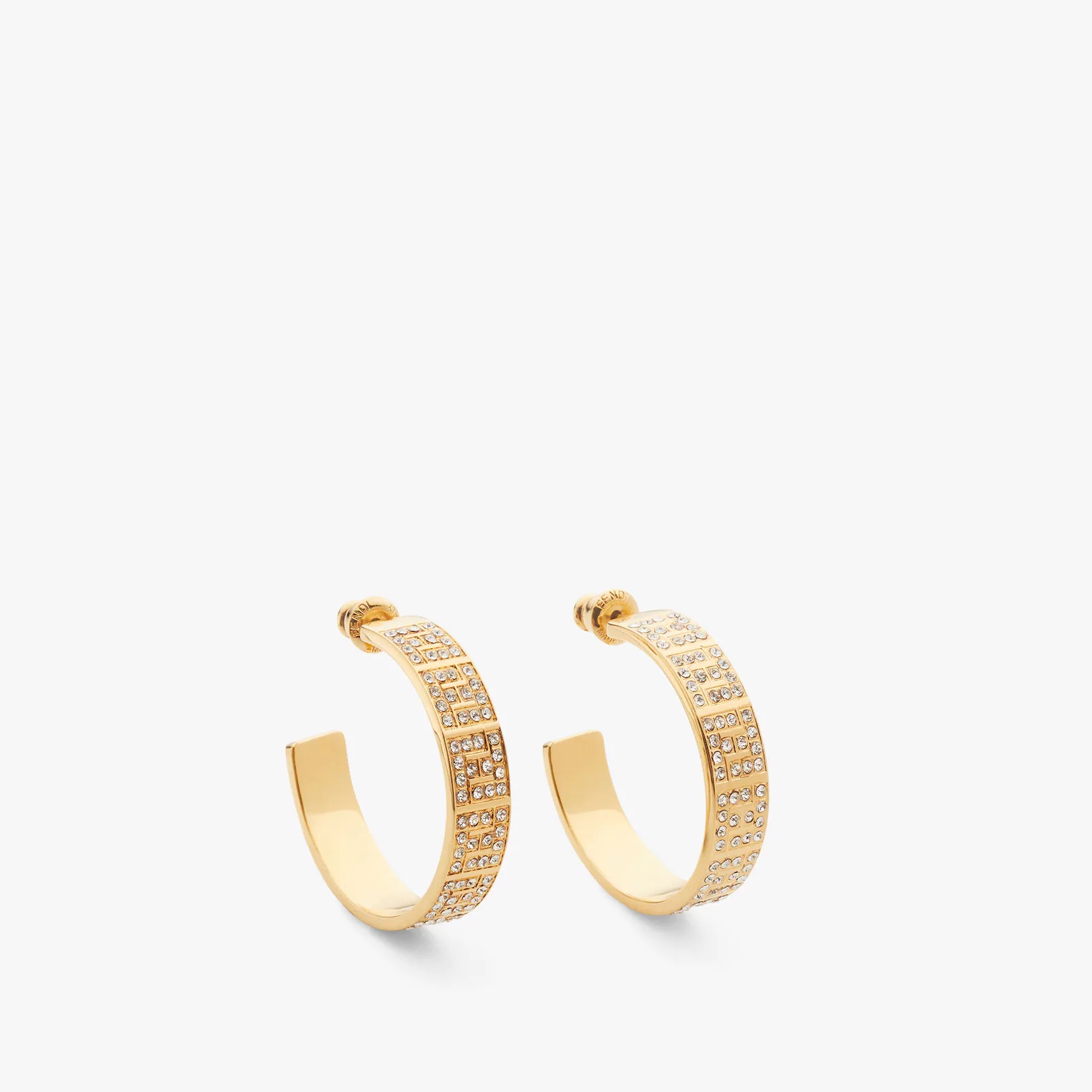 Hoop earrings with FF motif. Made of metal with a gold finish. Embellished with white crystals. Made in Italy Composition: 100% Brass, strass: 100% Crystal Product Code: 8AH3696GXF089U Product Care: The product you have purchased may be embellished with a precious metal top or varnish, and may also feature appliqués, stones (in various shades of the same color), crystals, plexiglass and resin. The mixture of materials and the unique features of the product are what give it its character. In order to best maintain the product’s appearance over time, we recommend avoiding contact with sea water, spa water, lacquers, perfumes, solvents, chemicals and abrasive materials. If necessary, clean with water and a neutral soap and/or polish with a dry microfiber cloth.