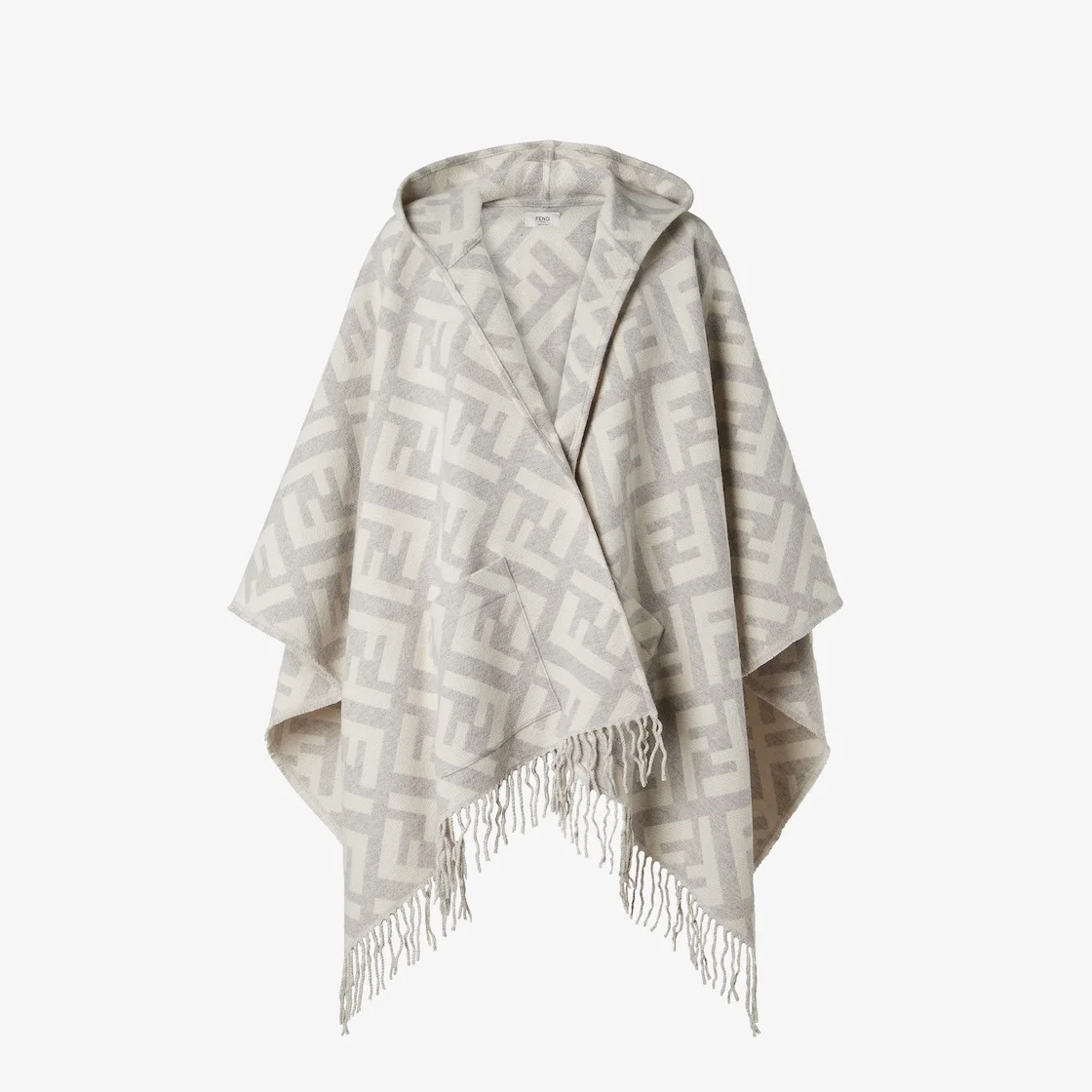 Poncho with hood and maxi pockets on the front. Made from pure cashmere with the macro FF motif in gray and white. Finished with fringes at the hem. Made in Italy Composition: 100% cashmere