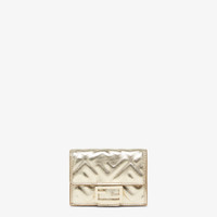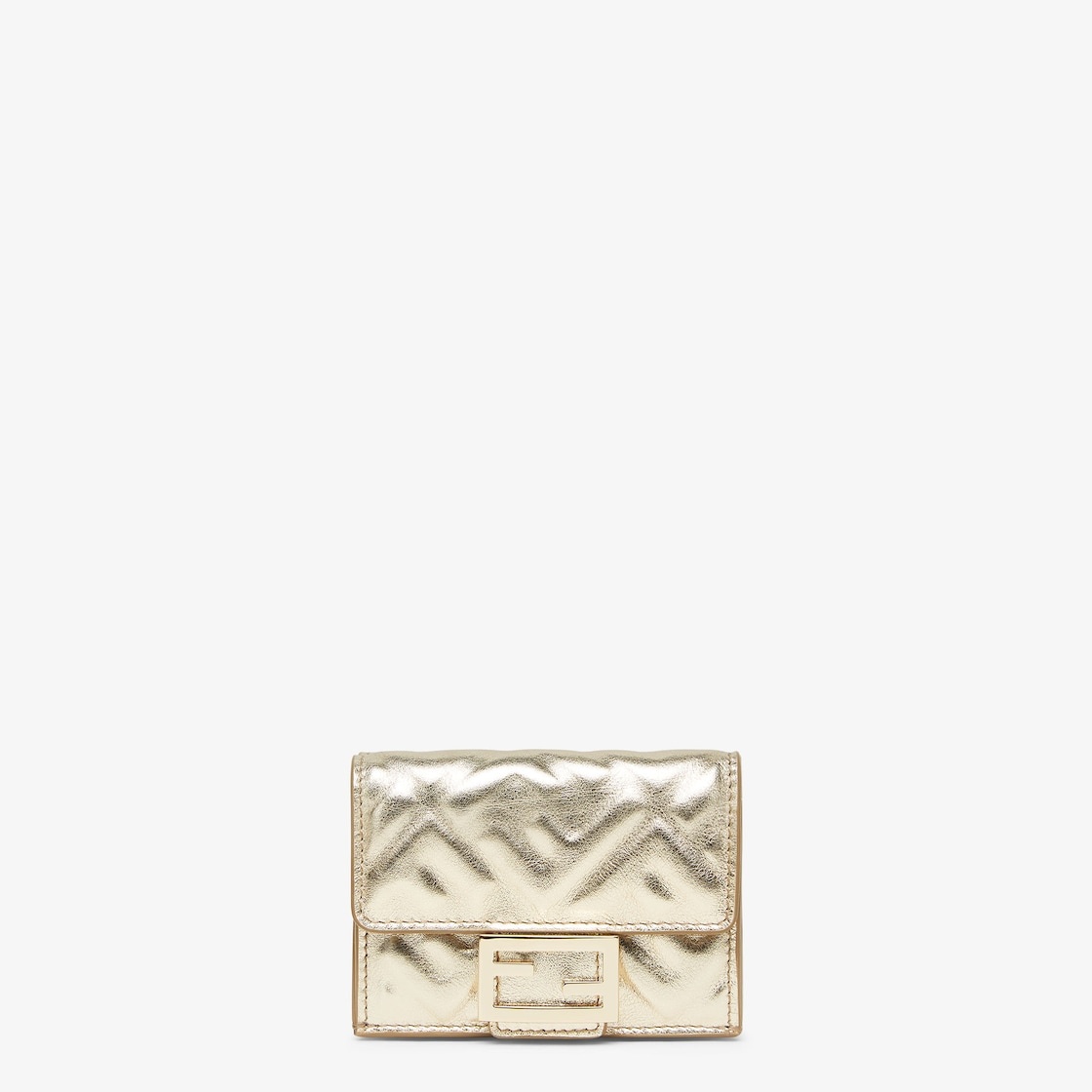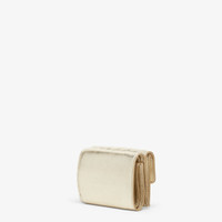 Compact, tri-fold Baguette wallet with large internal bill compartment, three concealed card holders and an external coin purse with a snap closure. Made of champagne-colored metallic calf leather with embossed FF motif. Gold-finish metalware. Made in Italy Composition: 100% calf leather, interior: 50% cotton, 42% polyamide, 8% resin Product Code: 8M0395ARO5F0FZ0