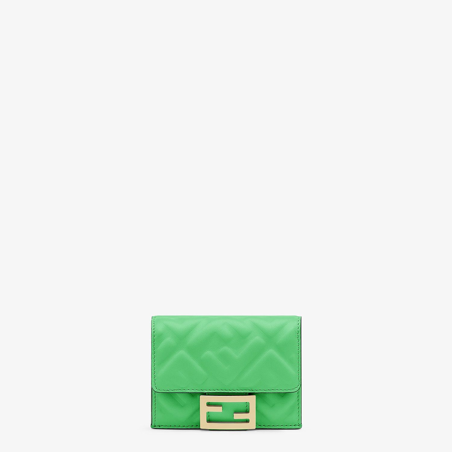 Compact, tri-fold Baguette wallet with large internal bill compartment, three concealed card slots and an external coin purse with press-stud fastening. Made of green nappa leather. Finished with embossed FF motif. Gold-finish metalware. Made in Italy PRODUCT INFORMATION - Product Code:: 8M0395AAJDF1B14 - Length:: 3.7 inches - Height:: 3 inches - Depth:: 1.2 inches - Composition:: 100% Lamb leather