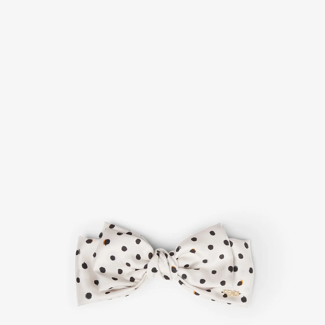 Bow-shaped hair clip. Made of ivory silk printed all-over with the FF motif in black. Decorated with the Fendi Roma lettering in metal on the front. Gold-finish metalware. Made in Italy Composition: 100% silk, 100% steel Product Code: FXT138AWEYF17JU