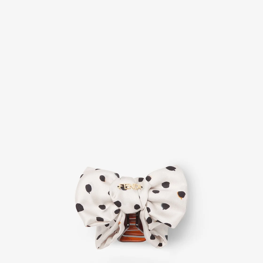 Claw hair clip with bow motif. Made of ivory silk printed all-over with the FF motif in black. Decorated with the Fendi Roma lettering in metal on the front. Made in Italy Composition: 100% silk, 100% methacrylate Product Code: FXT140AWEYF17JU