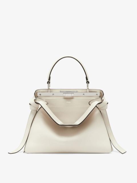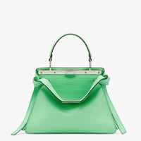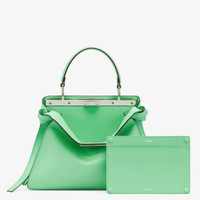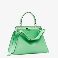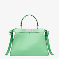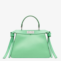 Iconic medium Peekaboo ISeeU bag, made of green leather with long knotted side laces, printed with a glossy-effect embossed Fendi Roma logo. Decorated with the iconic twist lock on both sides. Featuring a tone on tone soft nappa leather interior visible from the outside, two compartments separated by a stiff partition, a removable, customizable pocket and gold-finish metalware. Can be carried by hand or on the shoulder thanks to the handle and the adjustable, removable shoulder strap. Made in Italy Composition: : 100%calfleather, inside:100%lambleather Size worn: null Measurements: - Height: 25.5 cm - Depth: 13 cm - Width: 33.5 cm Product Code: 8BN321ANSDF1L1C