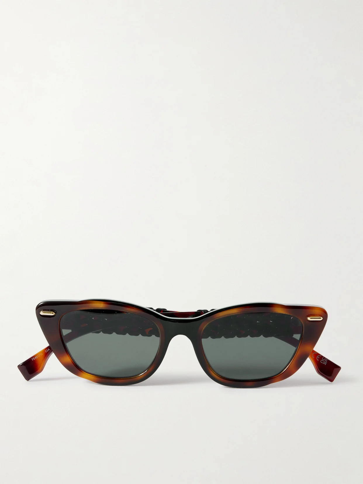 FENDI Eyewear's 'Interlace' sunglasses feature meticulously woven leather trims along the wide arms - an unexpected detail that speaks to the house's commitment to craftsmanship. They're made from tortoiseshell acetate in a cat-eye shape accented with gold-tone hardware to match the logo at the temples.