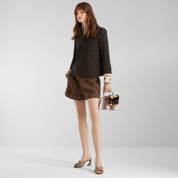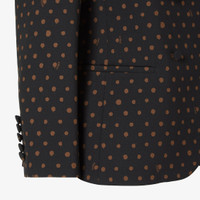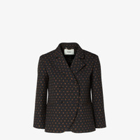 Short double-breasted jacket with lapel collar and 3/4 sleeves. Horizontal welt pockets. Lined. Covered button closure in matching tone. Lined. Made of a black wool blend fabric with an all-over, contrasting color Falena Dots micro motif print. Made in Italy Composition: 94% fleece wool, 4% polyamide, 1% elastane, 1% silk, lining: 100% cupro, 4 buttons: mother of pearl Product Code: FJ7676AW7EF1UL3