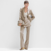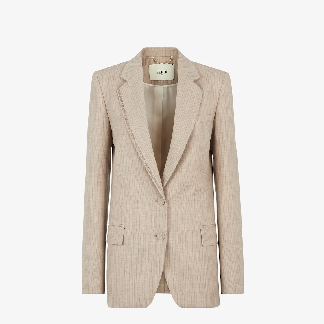 Single-breasted blazer with elongated silhouette. Lapel collar, set-in sleeves and center-back vent. Breast pocket and flap patch pockets on the front. Closure with two covered buttons. Made of beige pinstriped wool flannel. Finished with matching FENDI ROMA MADE IN ITALY micro lettering embroidered on the right lapel. Made in Italy Composition: 100% fleece wool, lining: 100% cupro Model height: 179 cm Size worn: 38 IT Product Code: FJ7450AM3PF1M2A