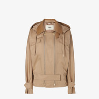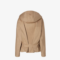 Blouson closed with two parallel full-length metal zippers, featuring a martingale at the front waist. Shirt collar, detachable drawstring hood and low-set sleeves with cuff straps. Patch pockets with button on the chest and side pockets. Made of beige cotton drill. Embellished with a tone-on-tone cotton collar and martingale, leather undercollar and Fendi logo embroidered on the right pocket. Palladium-finish metalware. Made in Italy Composition: 64% cotton, 36% polyamide, lining: 100% cupro, 5 buttons: mother of pearl Product Code: FJ7677AJYJF0QE3