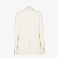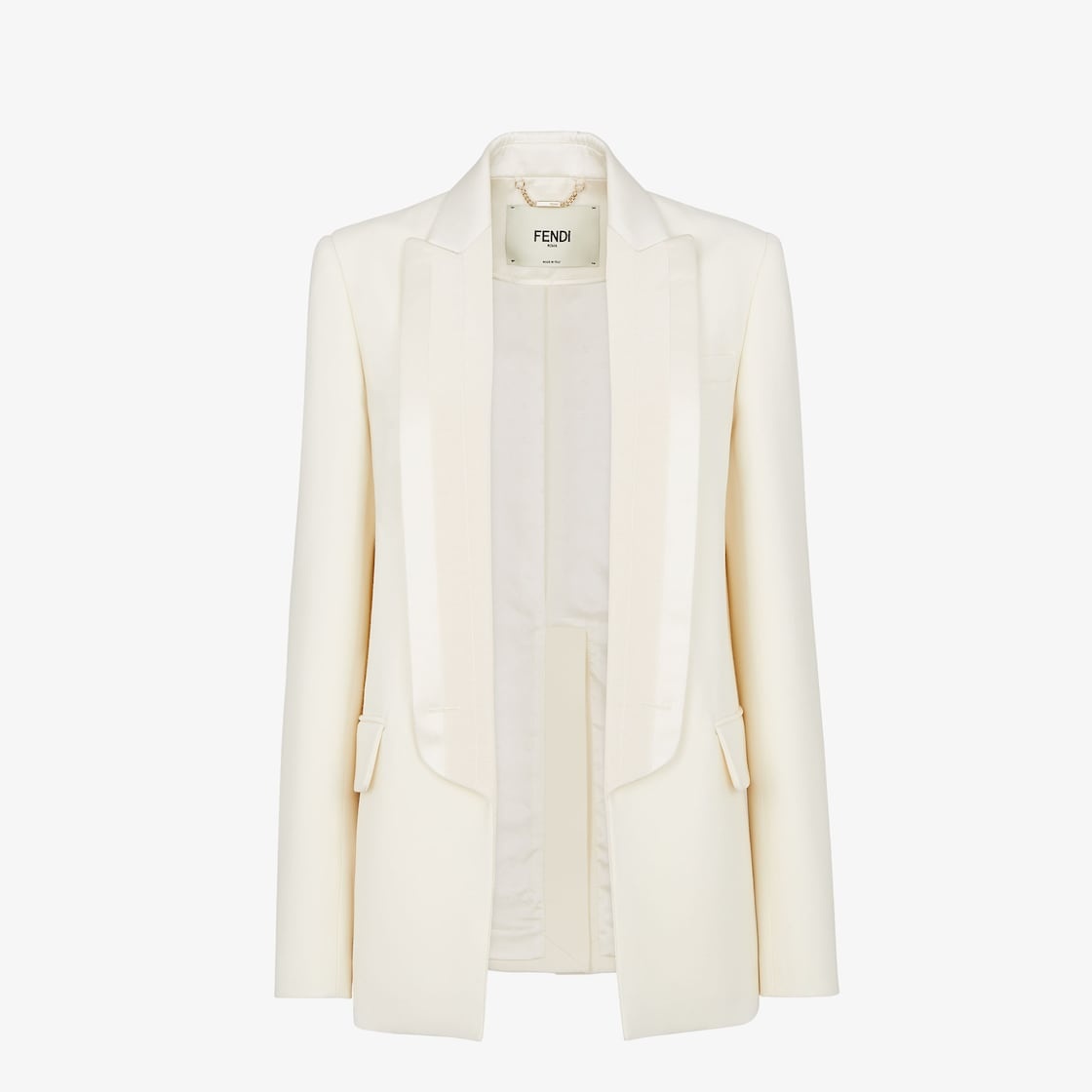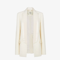 Tuxedo blazer with elongated lapels. Long sleeves with slits on the cuffs and vertical welt pockets with flap. Center slit at the back. Made of white wool and silk fabric. Embellished with matching grosgrain ribbon details and Fendi Roma logo embroidered on the left cuff. Made in Italy Composition: 77% wool, 23% silk, 100% viscose, 100% silk Fit: Regular Size worn: 38 IT. The model is 179 cm tall Product Code: FJ7586AC4GF0ZNM