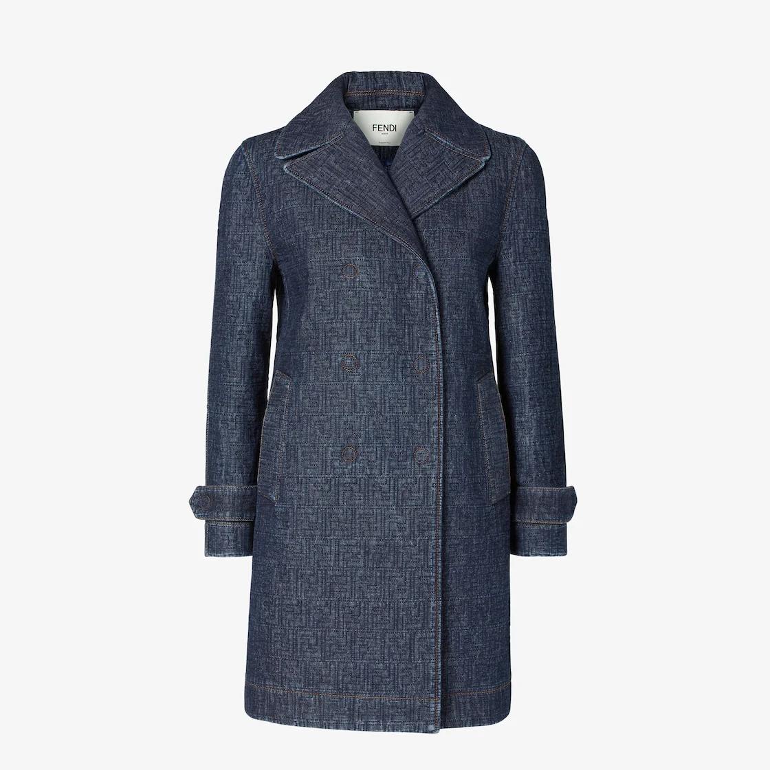 Straight-cut double-breasted midi jacket. Lapel collar and long sleeves with cuff straps. Welt side pockets. Front closure with concealed snap buttons. Made of dark blue denim with all-over quilted FF motif. Contrasting tobacco-colored stitching. Made in Italy Composition: 100% cotton, padding: 100% polyester Product Code: FLF842AW82F1UKI