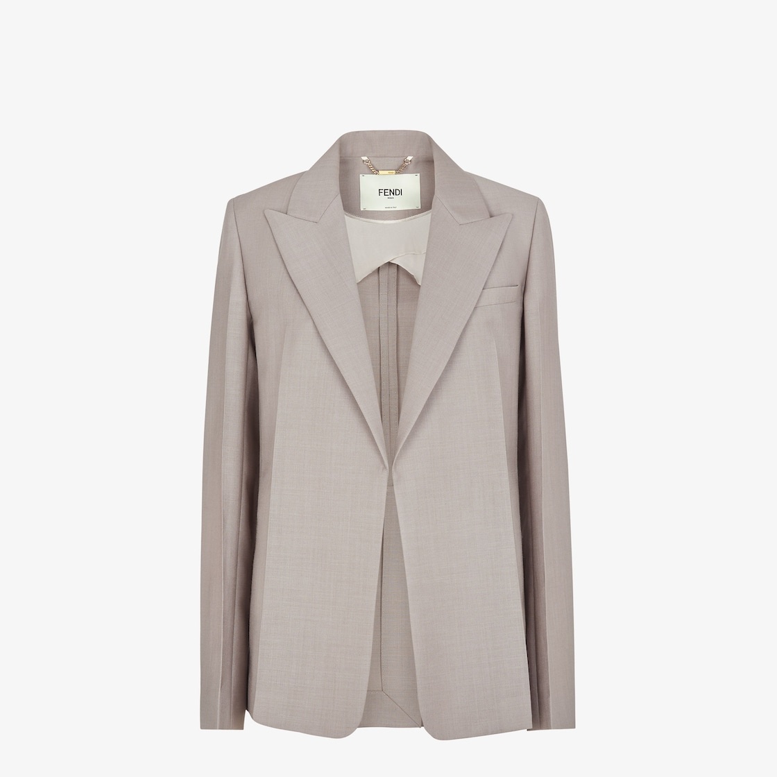 Tailored deconstructed jacket. Neckline with peak lapels and welt breast pocket. Set-in sleeves with small slits at the hem. Unlined with center-back vent. Single-breasted fastening. Made of dove gray kid mohair. Embellished with matching embroidered FF detail on the back of the collar. Made in Italy Composition: 60% mohair, 40% wool, fabric inner lining: 100% cupro, secondary lining: 100% viscose, buttons: 100% mother of pearl Size worn: 38 IT. The model is 179 cm tall Product Code: FJ7492S9AF0U6W