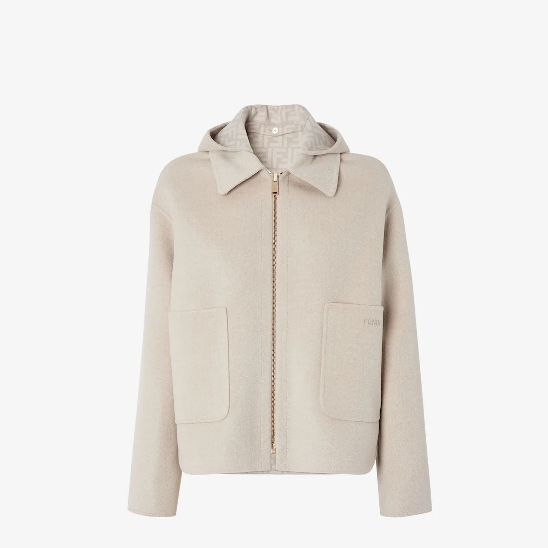 Reversible cropped, hooded jacket with wide, low-cut, sleeves. Zipper closure with double slider. Made of beige double-sided wool fabric. Lining customized with all-over FF motif. Made in Italy Composition: 99% fleece wool, 1% silk, lining: 100% silk, 7 buttons: mother of pearl Product Code: FJ7696A5HDF1MYZ