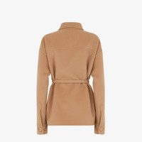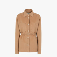 Single-breasted Go-To Jacket with shirt collar and low-cut set-in sleeves. Matching belt with metal Fendi O’Lock buckle. Oversized patch pockets on the chest. Made of camel-colored double-face cashmere. Embellished with Fendi lettering in matching-tone embroidery on the left breast pocket as worn. Made in Italy Composition: 100% Cashmere, nr 6 buttons: Mother-of-Pearl, nr 10 buttons: 100% calfskin, belt: 100% Silk Size worn: 38 IT. The model is 178 cm tall Product Code: FJ7235W18F0QU5