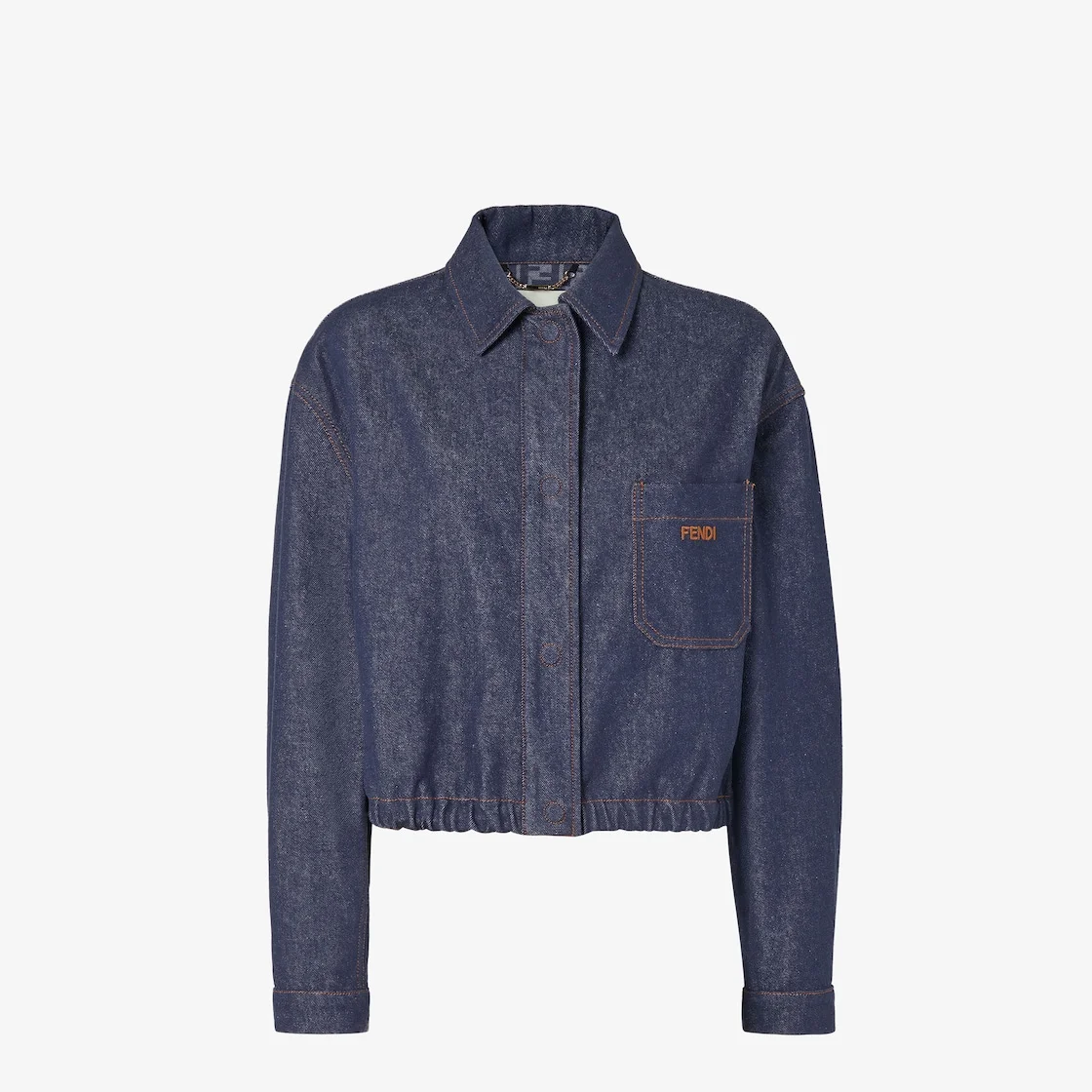 Cropped jacket with shirt collar and long sleeves. Elastic strap inserted at the hem, with buttonhole adjustment, to modify the fit and define the volume of the silhouette. Patch pocket on the chest and two patch pockets on the back. Concealed snap closure. Made of navy blue cotton denim. Lining with FF motif in the same colors. Embellished with contrasting stitching and Fendi logo embroidered on the front pocket. Made in Italy Composition: 100% cotton, 5 buttons: 100% mother of pearl Product Code: FLF856AOHSF0QB0