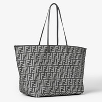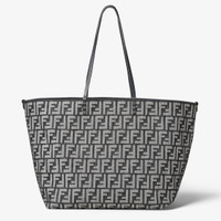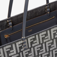 Large shopper bag, created in 1997 together with the Baguette and designed to partner it. A functional, timeless carry-all, it is the perfect combination of practicality and refined details. Featuring a reversible design, it is made of a dark blue denim-effect FF jacquard on one side and denim-effect jacquard on the other. It features a removable inner zipper pocket in dark blue leather and gold-finish metalware. It can be carried by hand or on the shoulder thanks to the dark blue calfskin handles finished with hand-stitched macro topstitching, an emblem of the iconic Selleria workmanship handed down through generations of Fendi artisans since 1925. Made in Italy Composition: 56% polyester, 40% cotton, 4% elastane, 100% calf leather, inside: 56% polyester, 40% cotton, 4% elastane Product Code: 8BH425AUT4F1UJ5