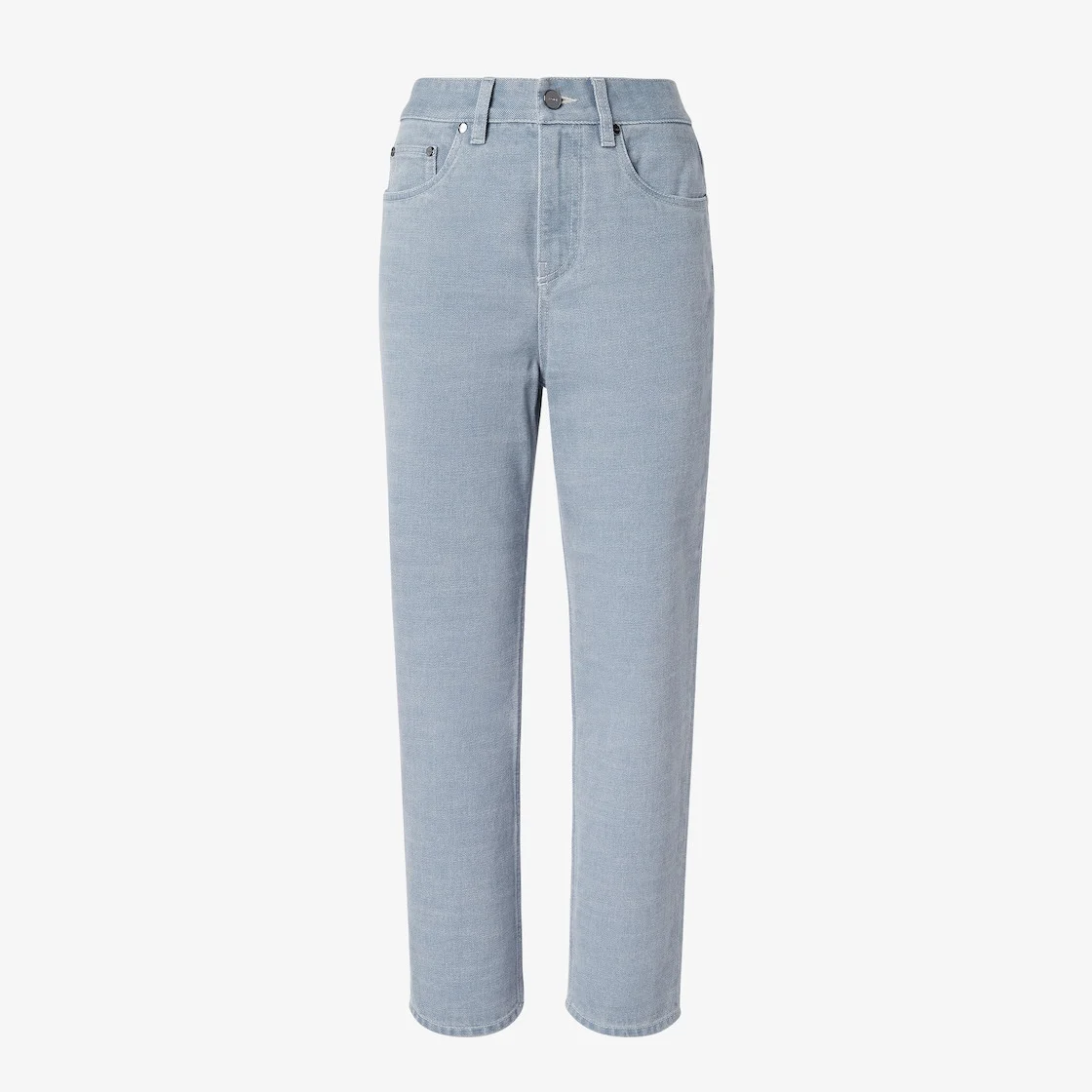 Straight-cut five-pocket pants. Belt loops at the waist. Concealed zipper and logo tack button closure. Made of light blue denim. Customized with Fendi Stamp 1925 patch on the back-right pocket. Tone-on-tone stitching and metal rivets. Made in Italy Composition: 100% cotton Size worn: 38 IT. The model is 178 cm tall Product Code: FLP864ASMBF1RX3