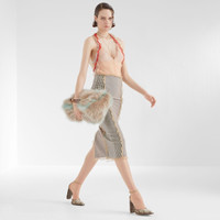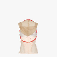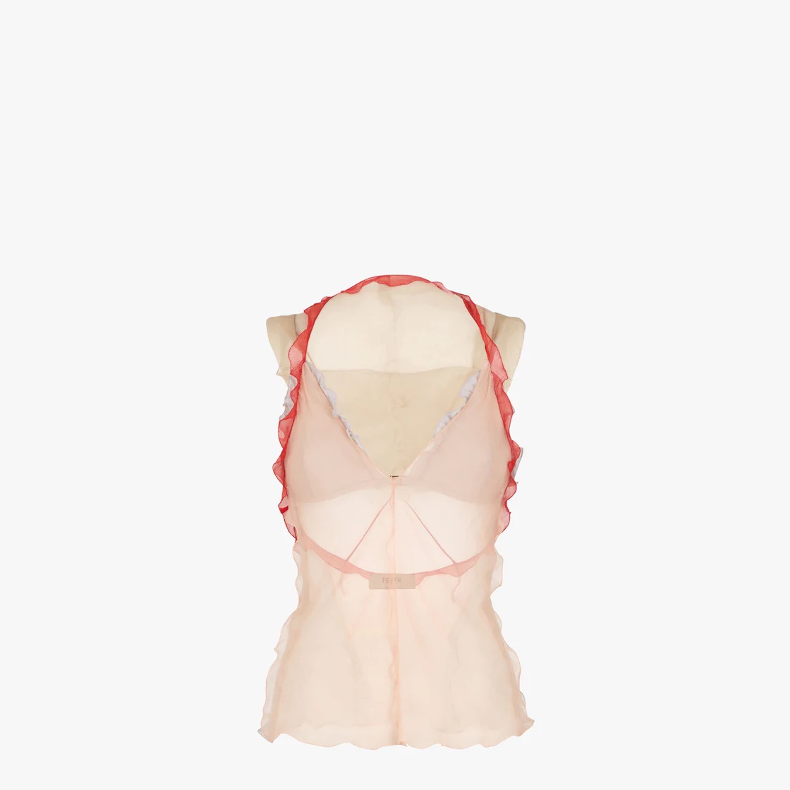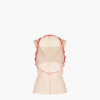Sleeveless top with wide V-neck and hood. Thin crisscross laces on a bare back. Made of light pink crepon chiffon. Embellished with matching tone and red ruffles around the neckline. Matching bra. Made in Italy Composition: : 100% Silk, bra: 100% Viscose Model height: 176 cm Size worn: 38 IT Product Code: FS7569AKSPF1JAG
