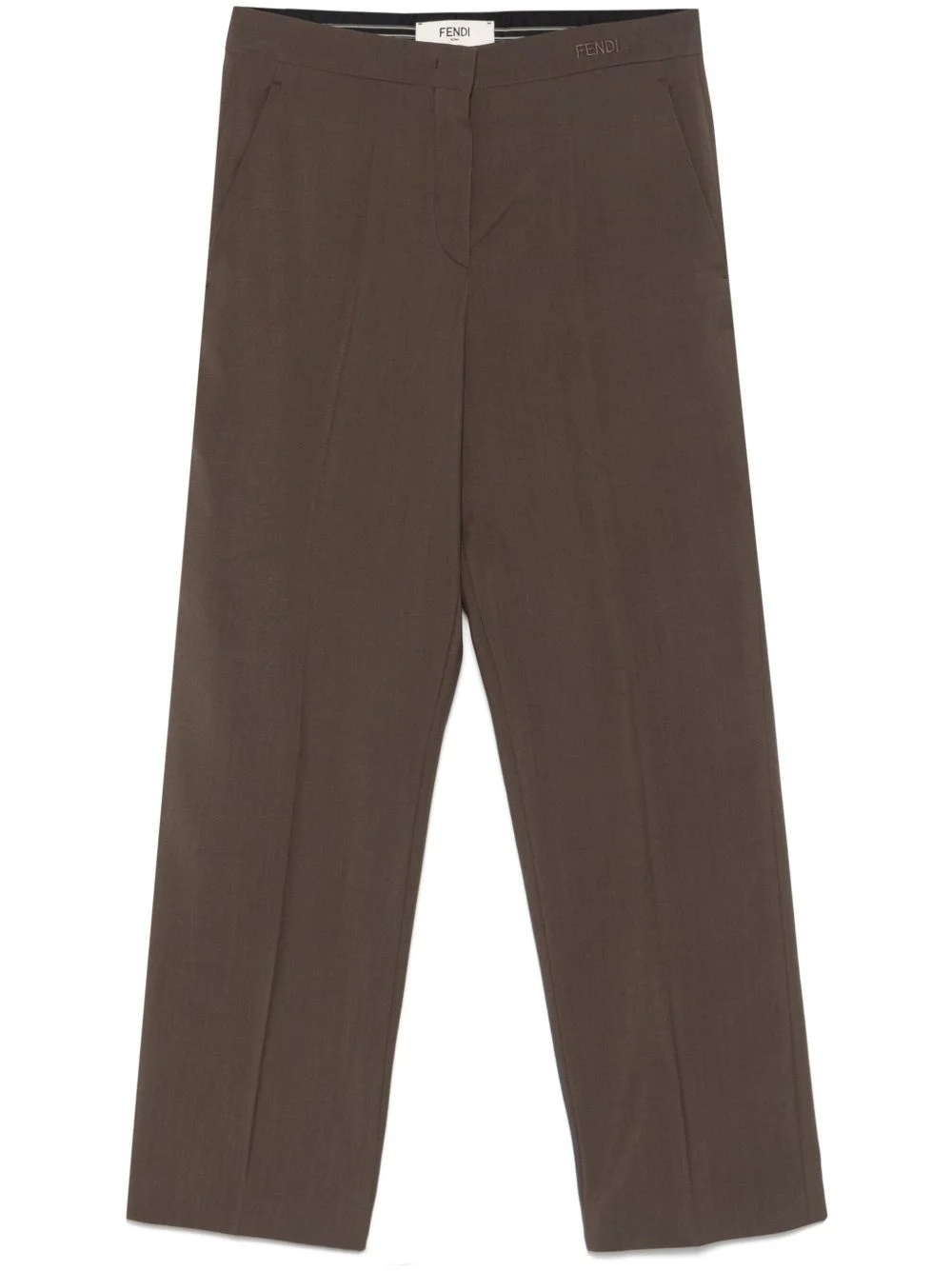 logo-embroidered trousers Highlights - Sepia brown - Concealed front button, hook and zip fastening - Two side slash pockets - Pressed crease Made in Italy Composition Outer: Wool 75%, Mohair 25% Lining: Silk 100% SIZE & FIT Model measurements Height 5 ft 9 in(1.75 m) Bust/Chest 31.88 in(81 cm) Hips 34.64 in(88 cm) Waist 24.01 in(61 cm) FittingInformation Designed for a tapered fit, these trousers allow for a close fit at the waist and a loose unrestricted fit over the leg with a closer fit towards the ankle Cropped in length Made from a midweight non-stretch fabric