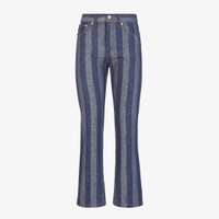 Slim-fit, five-pocket pants. Slightly flared at the hem and cropped at mid-calf level. Belt loops at the waist. Concealed zipper and logo tack button closure. Made of denim with iconic blue Pequin stripes. Back of belt with embroidered Fendi lettering. Tobacco-colored stitching and gold-finish metalware. Made in Italy Composition: 100% cotton Size worn: 38 IT. The model is 177 cm tall Product Code: FLP837AS8JF0QB0