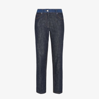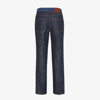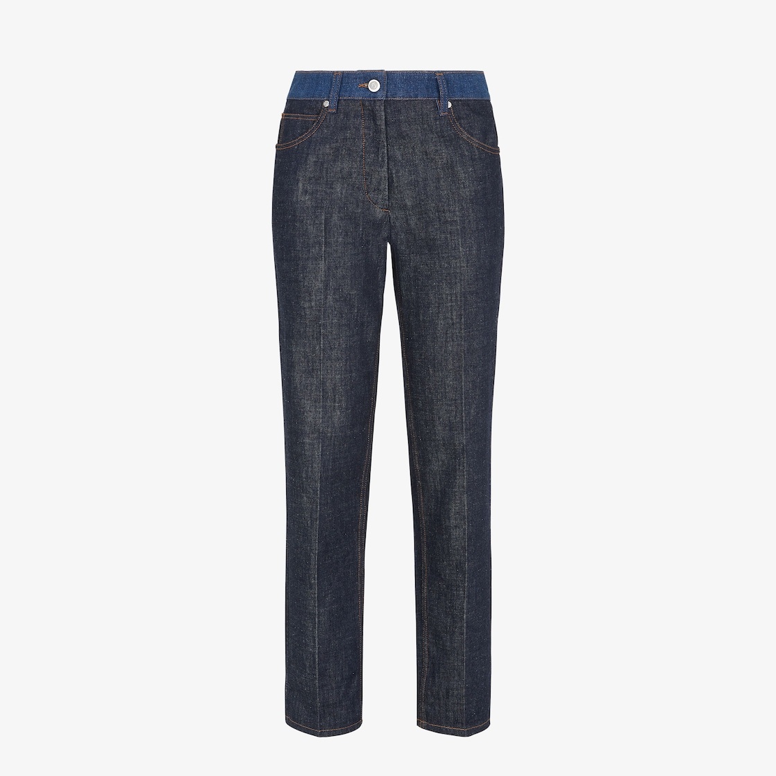 Slim-fit five-pocket pants. Belt loops at the waist. Concealed zipper and logo tack button closure. Made of dark blue denim with light blue denim insert at the waist, for a color block effect. Belt back in tan leather with an embossed FF logo. Contrasting stitching and palladium-finish metalware. Made in Italy Composition: 100% cotton Product Code: FLP851AT1AF1PNC