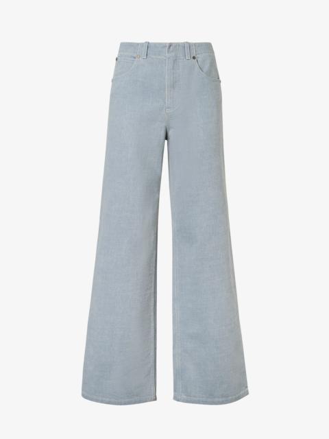 Flared five-pocket pants. Belt loops at the waist. Concealed button and zipper closure. Made of light brown denim. Customized with the Fendi Stamp 1925 motif embossed on the back-right pocket. Tone-on-tone stitching and metal rivets. Made in Italy Composition: 100% cotton Size worn: 38 IT. The model is 180 cm tall Product Code: FLP880ASMBF1RX9