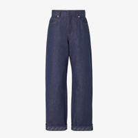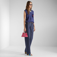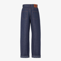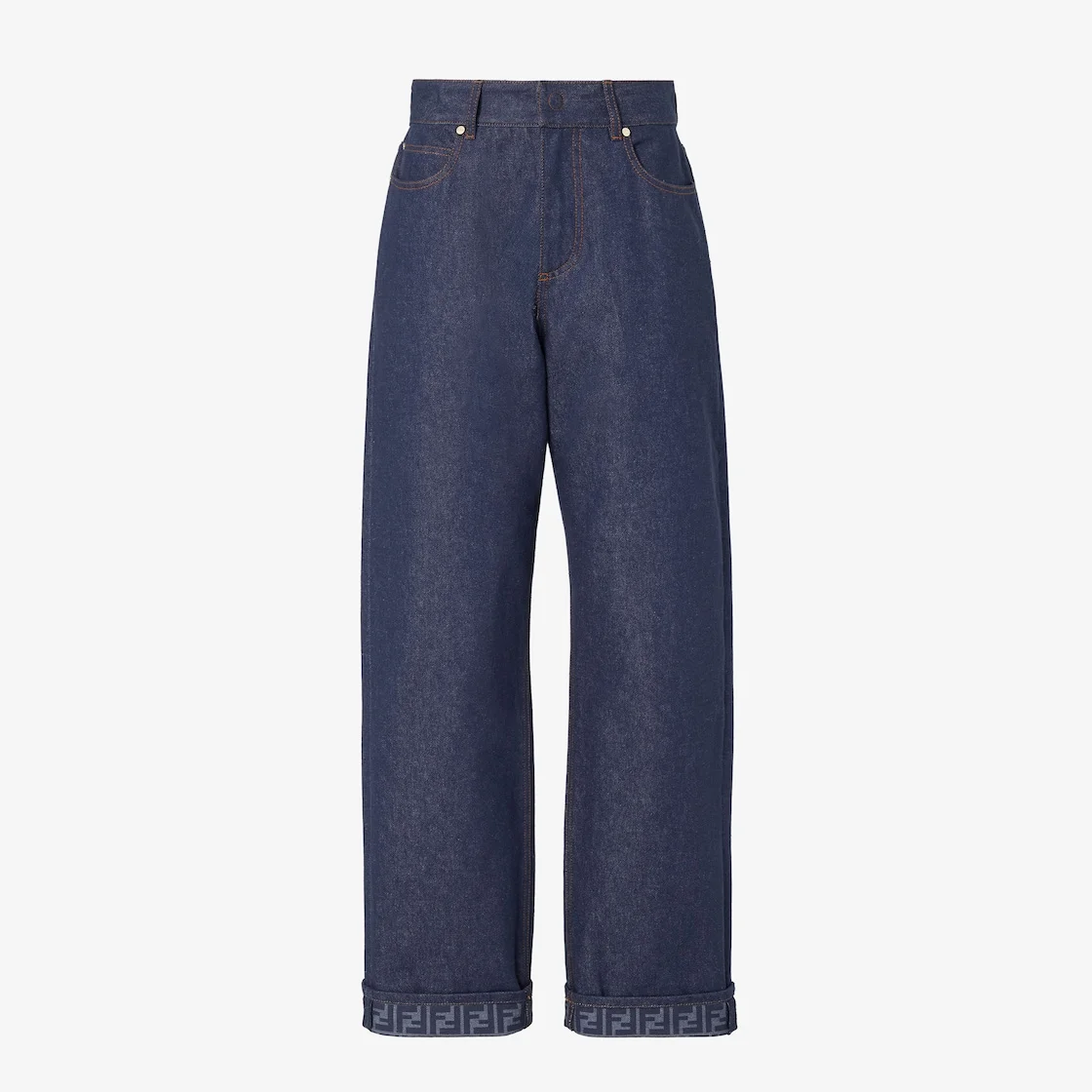 High-waisted five-pocket pants with a wide, straight leg. Concealed zipper and snap button closure. Made of navy blue denim. Lining with FF motif in the same tones and brown leather backstrap with Selleria FF detail. Contrasting stitching and palladium-finish metal rivets. Made in Italy Composition: 100% cotton Product Code: FLP882AOHSF0QB0