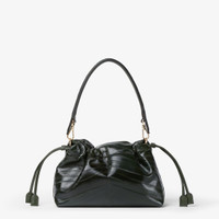Iconic medium Mamma Baguette bag, created in the late 1990s as a larger version of the iconic Baguette, hence the name Mamma Baguette. Updated for the Spring/Summer 2025 fashion show with a soft, deconstructed look, it retains the original elements of the bag and the iconic under-the-arm design. Made of premium forest green hagfish leather with a glossy finish, inlaid to create a chevron motif. The natural characteristics of the leather make each bag a unique piece. Completed by the FF clasp with a tone-on-tone leather insert. Large internal compartment lined in tone-on-tone suede with drawstring closure, with tone-on-tone soft nappa leather laces and customized details. Featuring a front flap and magnetic clasp. Gold-finish metalware. The bag can be worn either on the shoulder or cross-body thanks to the handle and shoulder strap, both detachable. Made in Italy Composition: 100% hag fish, inside: 100% calf leather Product Code: 8BR833AV5BF1TDL