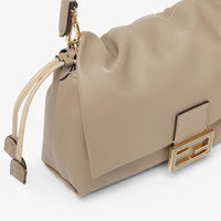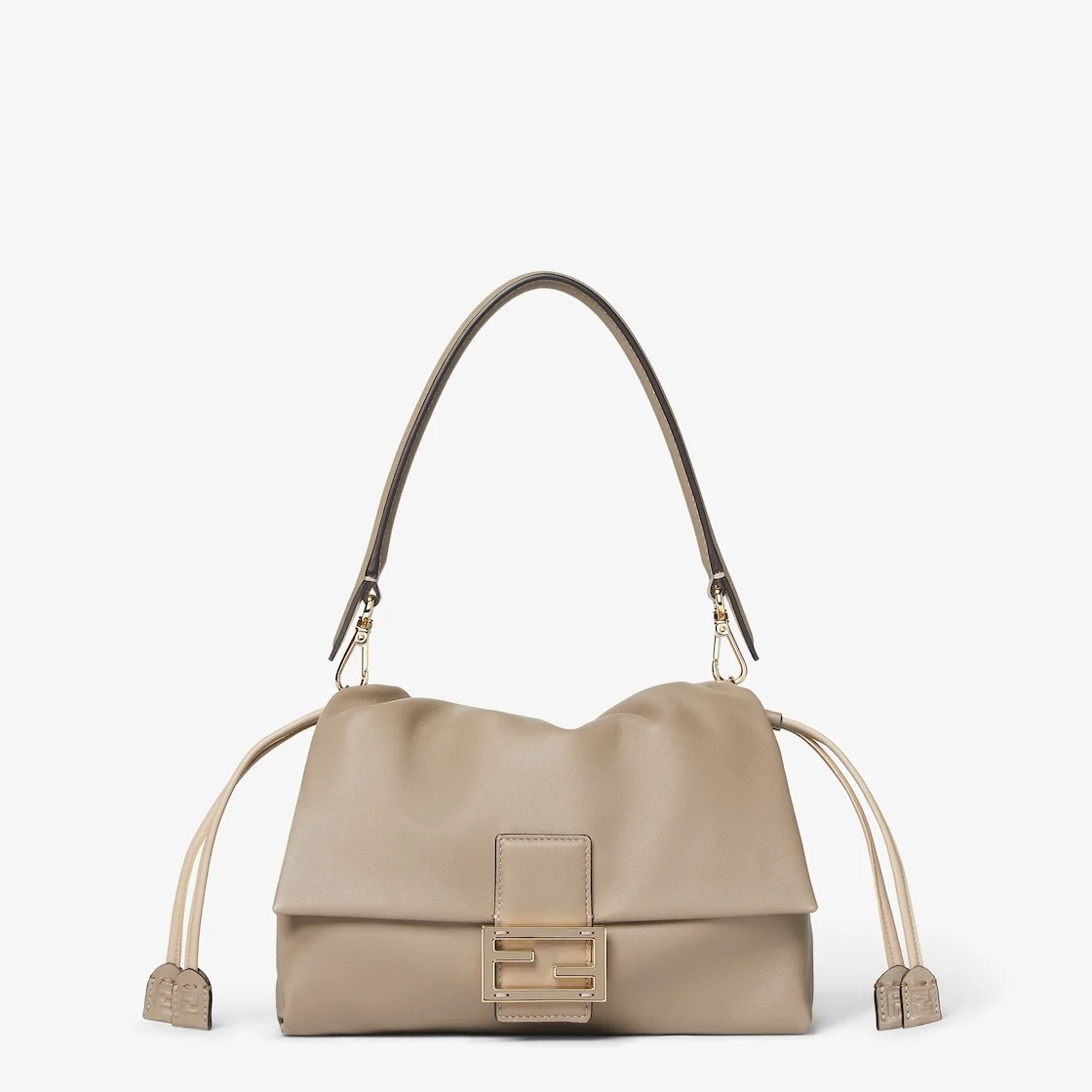 Iconic medium Mamma Baguette bag, created in the late 1990s as a larger version of the iconic Baguette, hence the name Mamma Baguette. Updated for the Spring/Summer 2025 fashion show with a soft, deconstructed look, it retains the original elements of the bag and the iconic under-the-arm design. Made of soft, dove gray nappa leather embellished with an oversized metal FF clasp with tone-on-tone leather insert. Large suede-lined internal compartment with drawstring closure featuring cream-colored leather ties and customized details. Featuring a front flap and magnetic clasp. Gold-finish metalware. The bag can be worn either on the shoulder or cross-body thanks to the handle and shoulder strap, both detachable. Made in Italy Composition: 100% lamb leather, inside: 100% calf leather Product Code: 8BR833AQ0DF0E65