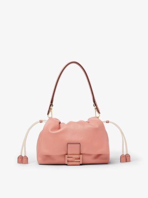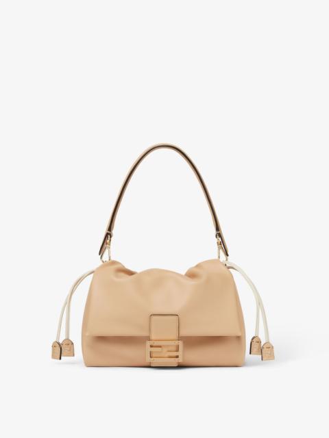 Iconic medium Mamma Baguette bag, created in the late 1990s as a larger version of the iconic Baguette, hence the name Mamma Baguette. Updated for the Spring/Summer 2025 fashion show with a soft, deconstructed look, it retains the original elements of the bag and the iconic under-the-arm design. Made of soft, mercury blue nappa leather, embellished with an FF clasp with tone-on-tone leather insert. Large suede-lined internal compartment with drawstring closure featuring beige leather cords and customized details. Featuring a front flap and magnetic clasp. Gold-finish metalware. The bag can be worn either on the shoulder or cross-body thanks to the handle and shoulder strap, both detachable. Made in Italy Composition: 100% lambskin, inside: 100% calfskin Product Code: 8BR833AQ0DF1UJC