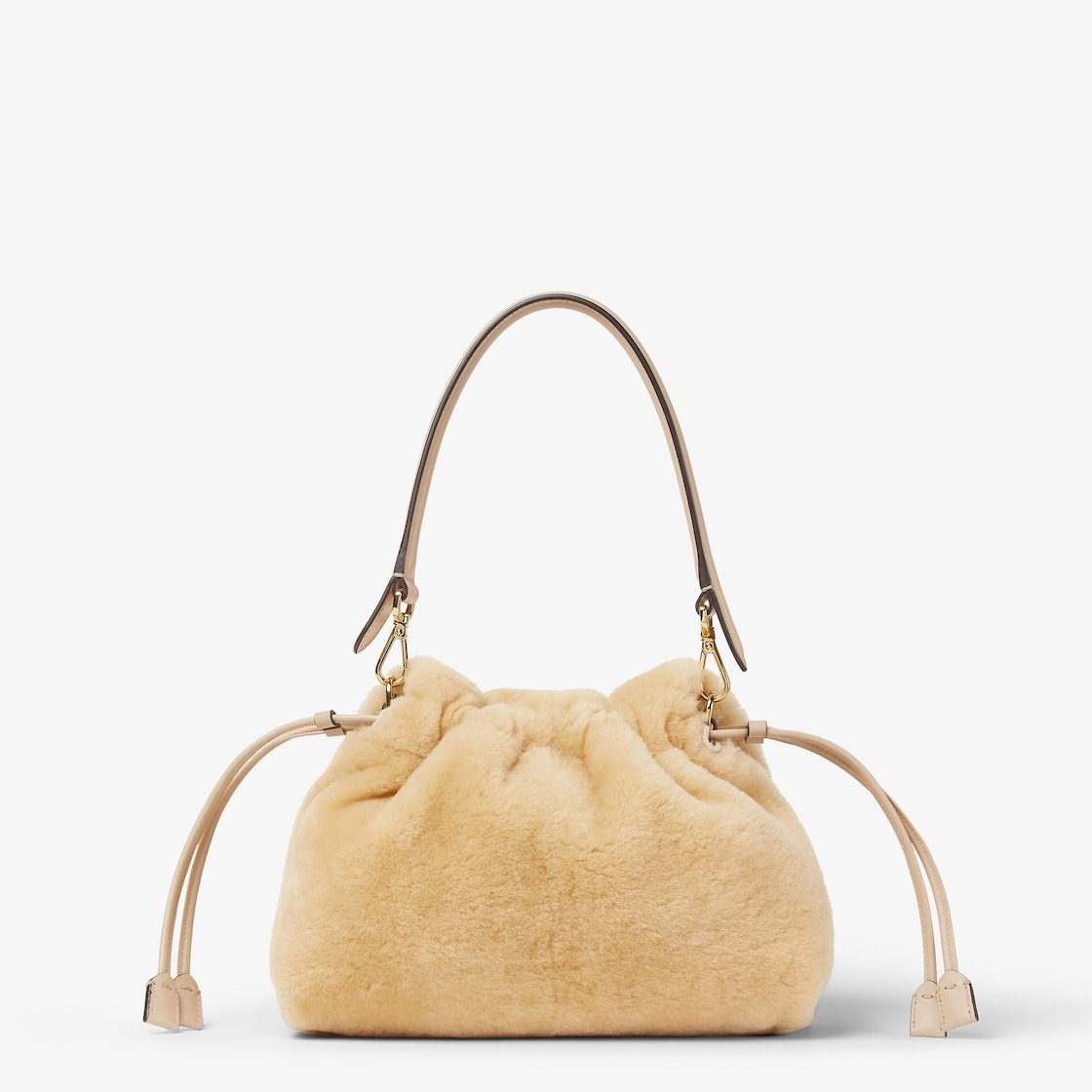 Iconic medium Mamma Baguette bag, created in the late 1990s as a larger version of the iconic Baguette, hence the name Mamma Baguette. Updated for the Spring/Summer 2025 fashion show with a soft, deconstructed look, it retains the original elements of the bag and the iconic under-the-arm design. Made of soft beige shearling, decorated with FF closure with beige leather insert. Large internal compartment lined in tone-on-tone suede with drawstring closure, with tone-on-tone soft nappa leather laces and customized details. Featuring a front flap and magnetic clasp. Gold-finish metalware. It can be carried on the shoulder or cross-body thanks to the handle and the beige nappa leather shoulder strap, both removable. Made in Italy Composition: 100% sheep fur, inside: 100% calf leather Product Code: 8BR833AYCUF0NGA
