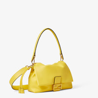 Iconic medium Mamma Baguette bag, created in the late 1990s as a larger version of the iconic Baguette, hence the name Mamma Baguette. Updated for the Spring/Summer 2025 fashion show with a soft, deconstructed look, it retains the original elements of the bag and the iconic under-the-arm design. Made of soft broom yellow nappa leather embellished with an FF clasp with tone on tone leather insert. Large internal compartment lined in suede with drawstring closure, with tone-on-tone leather laces and customized details. Featuring a front flap and magnetic clasp. Gold-finish metalware. The bag can be worn either on the shoulder or cross-body thanks to the handle and shoulder strap, both detachable. Made in Italy Composition: 100% lambskin, inside: 100% calfskin Product Code: 8BR833AQ0DF1TD0