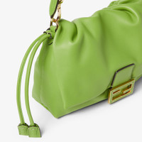 Iconic medium Mamma Baguette bag, created in the late 1990s as a larger version of the iconic Baguette, hence the name Mamma Baguette. Updated for the Spring/Summer 2025 fashion show with a soft, deconstructed look, it retains the original elements of the bag and the iconic under-the-arm design. Made of soft, forest green nappa leather embellished with an oversized metal FF clasp with tone-on-tone leather insert. Large internal compartment lined in suede with drawstring closure, with tone-on-tone leather laces and customized details. Featuring a front flap and magnetic clasp. Gold-finish metalware. The bag can be worn either on the shoulder or cross-body thanks to the handle and shoulder strap, both detachable. Made in Italy Composition: 100% lambskin, inside: 100% calfskin Product Code: 8BR833AQ0DF1W6A