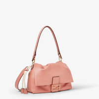 Iconic medium Mamma Baguette bag, created in the late 1990s as a larger version of the iconic Baguette, hence the name Mamma Baguette. Updated for the Spring/Summer 2025 fashion show with a soft, deconstructed look, it retains the original elements of the bag and the iconic under-the-arm design. Made of soft, pink nappa leather embellished with an oversized metal FF clasp with tone-on-tone leather insert. Large suede-lined internal compartment with drawstring closure featuring cream-colored leather ties and customized details. Featuring a front flap and magnetic clasp. Gold-finish metalware. The bag can be worn either on the shoulder or cross-body thanks to the handle and shoulder strap, both detachable. Made in Italy Composition: 100% lambskin, inside: 100% calfskin Product Code: 8BR833AQ0DF13VM