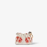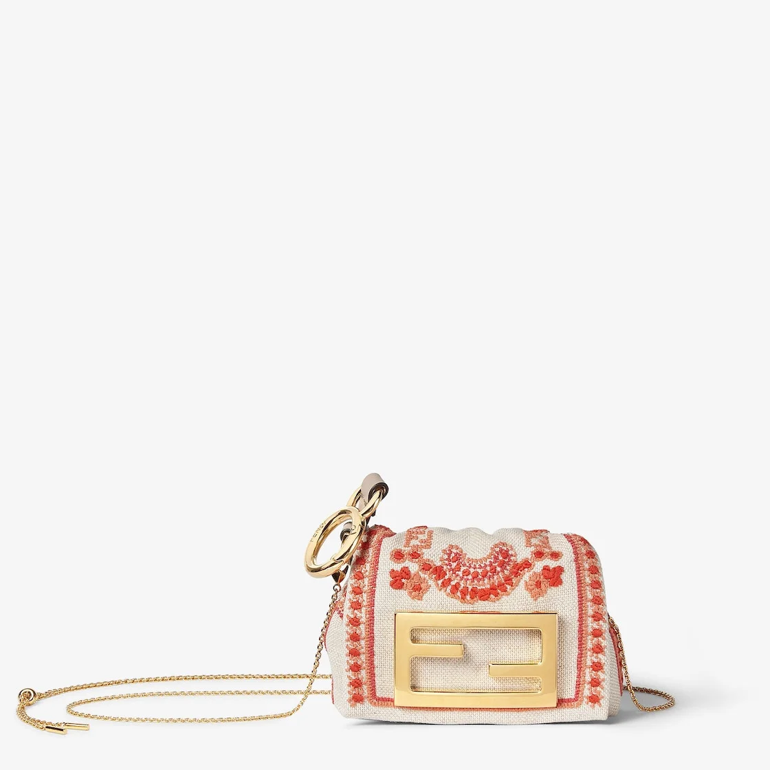 Iconic Nano Mamma Baguette bag. Featuring an FF clasp and magnetic button under the flap. The bag can be attached as a charm with the clip or worn on the shoulder and crossbody thanks to the adjustable chain shoulder strap. Made of natural-tone cotton and linen canvas. Embellished with red embroidery that echoes the season’s Coral Bandana graphics. Gold-finish metalware. It can hold a card with keys and lipstick, or a Fendi mini fragrance, headphones and a lipstick. Made in Italy Composition: 56% linen, 44% cotton, embroidery: 100% polyester, inside: 56% linen, 44% cotton Product Code: 7AS368AV5XF1SXS