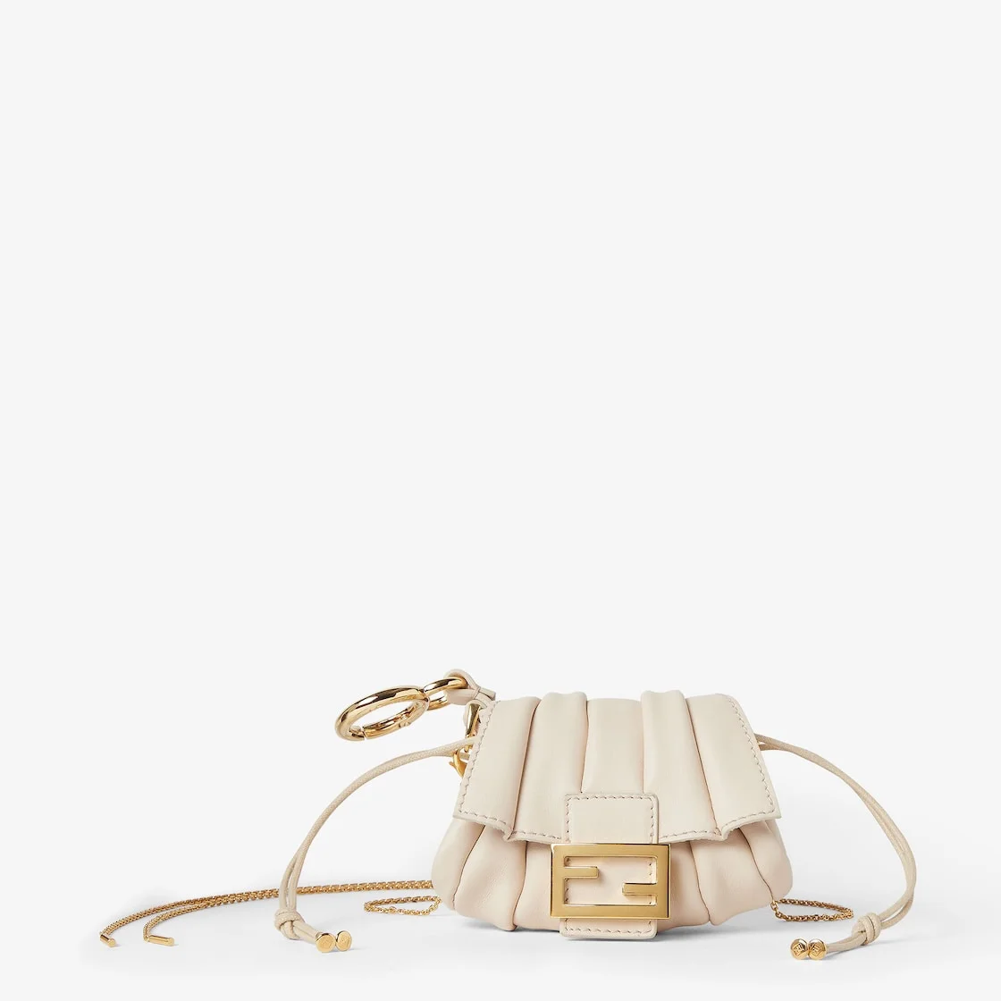 Iconic Nano Mamma Baguette bag. Featuring an FF clasp and magnetic button under the flap. Drawstring closure with laces and customized metal details. The bag can be attached as a charm with the clip or worn on the shoulder and crossbody thanks to the adjustable chain shoulder strap. Made of finely pleated calfskin to create a soft, three-dimensional texture that recalls the iconic Pequin striped motif. Gold-finish metalware. Made in Italy Composition: 100% calf leather, inside: 100% calf leather Product Code: 7AS420AYJGF0VWM