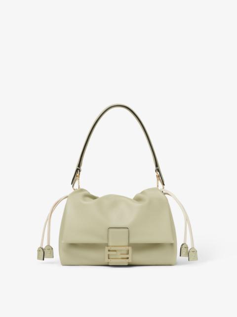 Iconic medium Mamma Baguette bag, created in the late 1990s as a larger version of the iconic Baguette, hence the name Mamma Baguette. Updated for the Spring/Summer 2025 fashion show with a soft, deconstructed look, it retains the original elements of the bag and the iconic under-the-arm design. Made of soft cappuccino-colored nappa leather, completed by an FF clasp with tone on tone leather insert. Large suede-lined internal compartment with drawstring closure featuring cream-colored leather ties and customized details. Featuring a front flap and magnetic clasp. Gold-finish metalware. The bag can be worn either on the shoulder or cross-body thanks to the handle and shoulder strap, both detachable. Made in Italy Composition: 100% lamb leather, inside: 100% calf leather Product Code: 8BR833AQ0DF19P8