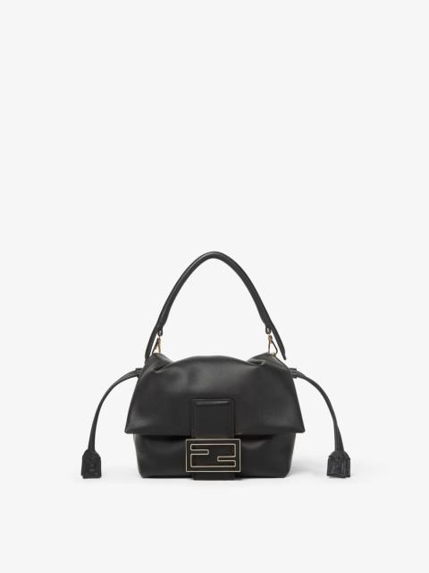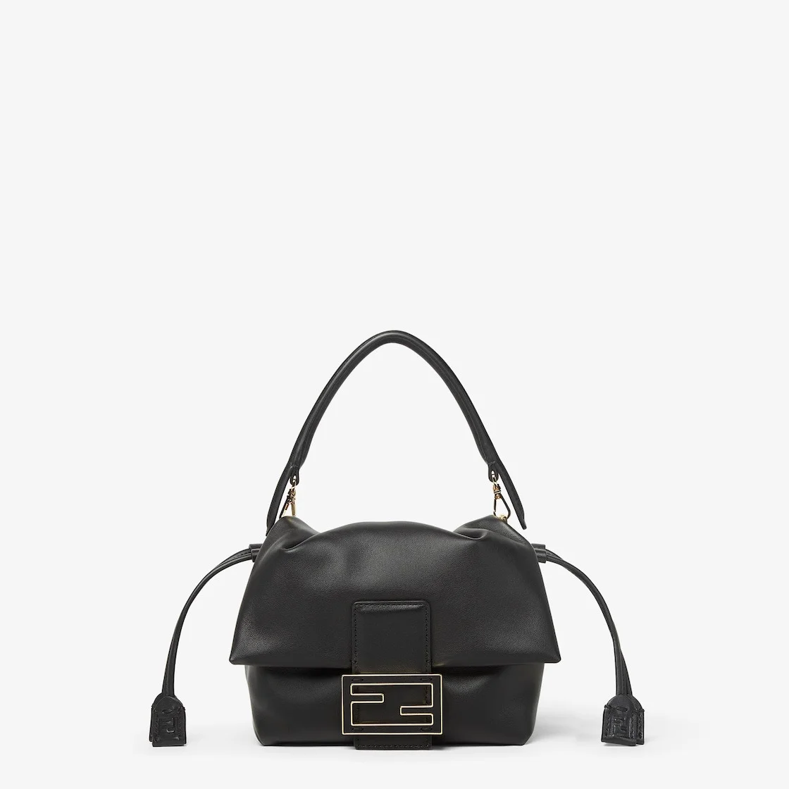 Iconic small Mamma Baguette bag, created in the late 1990s as a larger version of the iconic Baguette, hence the name Mamma Baguette. Updated for the Spring/Summer 2025 fashion show with a soft, deconstructed look while retaining the original elements of the bag. Made of soft, black nappa leather embellished with a metal FF clasp with tone-on-tone leather insert. Large suede-lined internal compartment with drawstring closure featuring black leather ties and customized details. Featuring a front flap and magnetic clasp. Gold-finish metalware. Can be carried by hand or worn cross-body thanks to the handle and shoulder strap, both detachable. Made in Italy Composition: 100% lamb leather, inside: 100% calf leather Product Code: 8BS105ABVEF0KUR