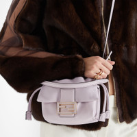 Iconic small Mamma Baguette bag, created in the late 1990s as a larger version of the iconic Baguette, hence the name Mamma Baguette. Updated for the Spring/Summer 2025 fashion show with a soft, deconstructed look while retaining the original elements of the bag. Made of soft, anemone purple nappa leather embellished with an oversized metal FF clasp with tone on tone leather insert. Large internal compartment lined in suede with drawstring closure, with tone-on-tone leather laces and customized details. Featuring a front flap and magnetic clasp. Gold-finish metalware. Can be carried by hand or worn cross-body thanks to the handle and shoulder strap, both detachable. Made in Italy Composition: 100% lambskin, inside: 100% calfskin Product Code: 8BS105ABVEF1BZE