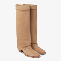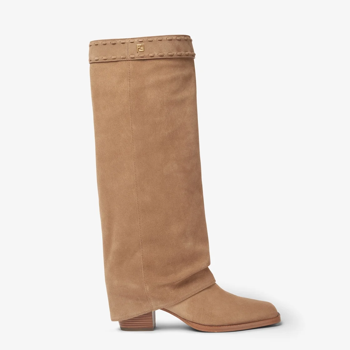 Square toe boots with tubular leg. Hand made in dark dove gray suede. The leg partially covers the heel creating a trompe l’oeil effect and soft creases on the front. FF strap at the knee, finished with hand-sewn tone-on-tone macro stitching, an emblem of the iconic Selleria workmanship handed down through generations of Fendi artisans since 1925. Gold-finish metalware. Made in Italy Composition: 100% calfskin, inside: 100% calfskin Product Code: 8W8566QK9F1VD1