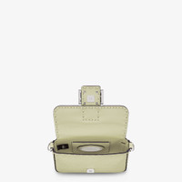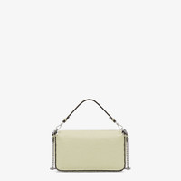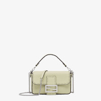 Mini iconic Baguette bag made with 309 hand-sewn tone-on-tone macro topstitches, an emblem of the iconic Selleria workmanship handed down through generations of Fendi artisans since 1925. Made of sage green Cuoio Romano leather, calfskin with a characteristic natural grain, produced with a metal-free tanning process. Featuring a front flap, magnetic clasp, one internal compartment lined in calfskin and an internal pocket. Selleria logo plate in silver, palladium-finish metalware. Decorated with an FF clasp. The bag can be carried by hand or worn on the shoulder thanks to the handle and shoulder strap, both detachable. Holds a 6.7-inch smartphone, Mini Trifold card holder or wallet, keys and lipstick. Made in Italy Composition: 100% calf leather, inside: 100% sheep leather Product Code: 8BS017ARBBF1GMK
