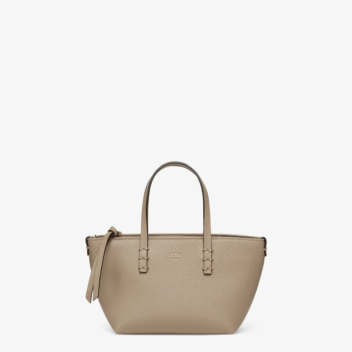 Mini shopper bag, inspired by the bag launched in 1997 together with the Baguette, and designed to partner it. It is the perfect combination of practicality and refined details. Made with 62 hand-sewn tone-on-tone macro topstitches, an emblem of the iconic Selleria workmanship handed down through generations of Fendi artisans since 1925. Made of dove gray Cuoio Romano leather, calfskin with a characteristic natural grain, produced with a metal-free tanning process. Featuring an interior compartment lined in jacquard fabric with the iconic brown FF motif, leather Selleria stamp and gold-finish metalware. The bag can be carried by hand with the two handles, or worn either on the shoulder or cross-body with the adjustable, detachable shoulder strap. Made in Italy Composition: 100% calf leather, inside: 62% polyester, 33% cotton, 5% resin Product Code: 8BS096AS84F1Q6E