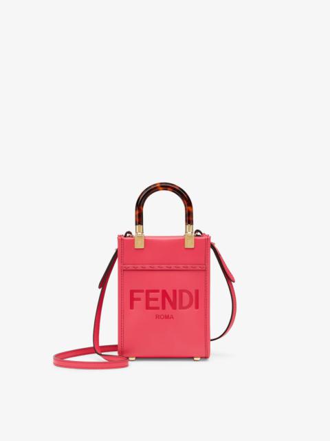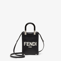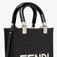 Mini Sunshine Shopper bag made of black leather with hot-stamped white FENDI ROMA lettering and stiff black plexiglass handles. Features a lined internal compartment, tone-on-tone leather edges and palladium-finish metalware. Can be carried by hand or worn on the shoulder thanks to the two handles and thin adjustable detachable shoulder strap. Made in Italy Composition: 100% calf leather, 100% polymethyl methacrylate, inside: 48% polyamide, 46% polyester, 6% resin Model height: null Size worn: null Measurements: - Height : 18 cm - Depth : 6.5 cm - Width : 13 cm - Weight : 0.24 kg - Shoulder strap drop : 63 cm Product Code: 8BS051ABVLF1L2Z