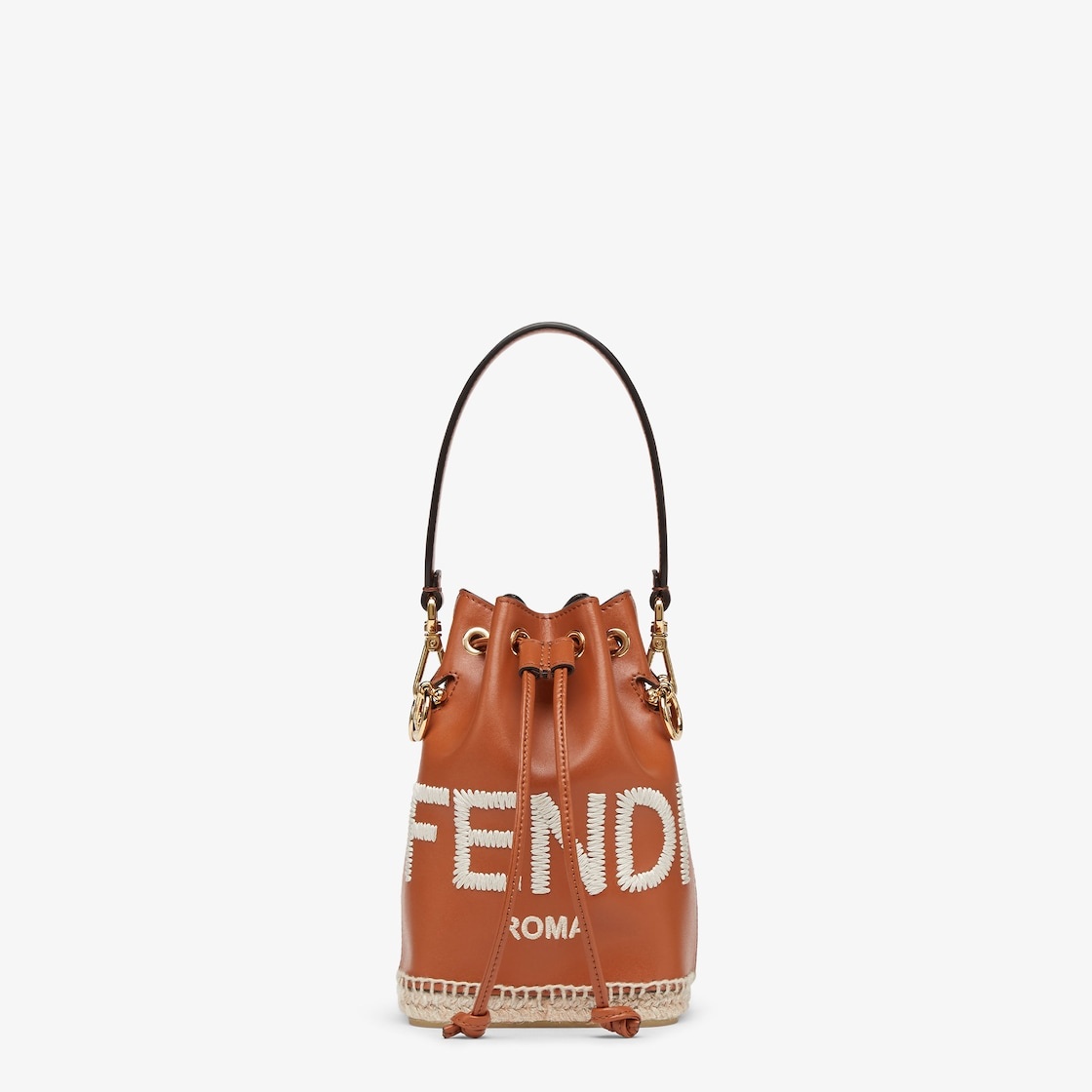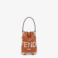 Small Mon Tresor bucket bag in brown leather with brown FENDI ROMA embroidery and base made using an espadrilles technique. Lined and with gold-finish metalware. Featuring two detachable shoulder straps, one long and one short, to wear the bag over the shoulder or cross-body. Made in Italy Composition: 100% Calfskin, interior: 50% Polyamide, 50% Polyurethane Model height: null Size worn: null Measurements: - Height : 18 cm - Depth : 10 cm - Width : 12 cm Product Code: 8BS010ANWWF1C6J