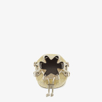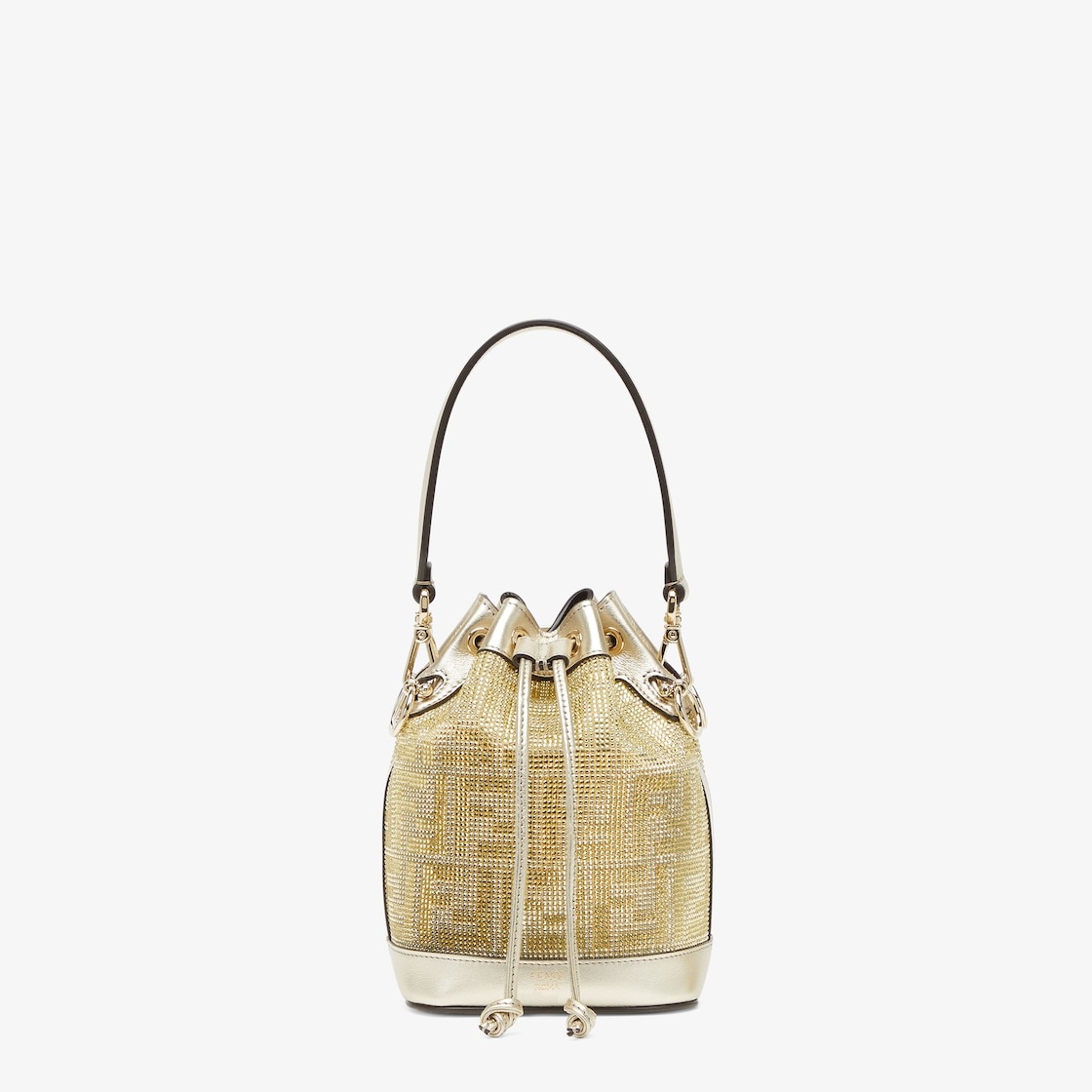 Iconic Mon Tresor bucket bag, distinguished by a timeless, compact and spacious silhouette. Made of suede entirely covered in small crystals and multi-faceted studs that create the FF motif all over in a champagne color. Lined and with gold-finish metalware. Double handle and adjustable and detachable shoulder strap for carrying the bag by hand on the shoulder or cross-body, both made of champagne-colored metallic calfskin. Holds a 6.7-inch smartphone, Mini Trifold card holder or wallet, keys and lipstick. Made in Italy Composition: 100% calf leather, embroidery: 100% synthetic stone, 100% aluminum, inside: 60% polyamide, 40% polyurethane Product Code: 8BS093AT4NF1QDR