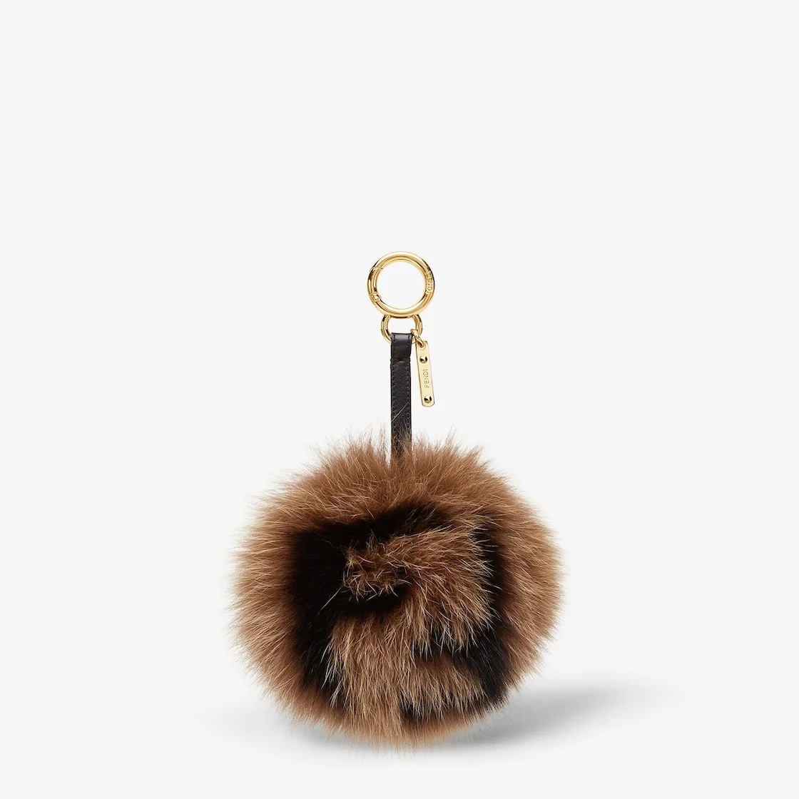 Pom-pom charm with leather strap, clip and customized Fendi logo plate. Made of fox fur with FF motif inset in the iconic brown and black colors. Gold-finish metalware. Made in Italy PRODUCT INFORMATION - Product Code:: 7AR683A3VCF0TWL - Composition:: 100% Fox fur, 100% Lamb leather
