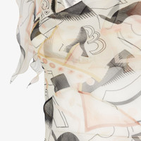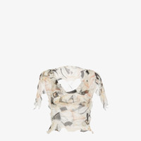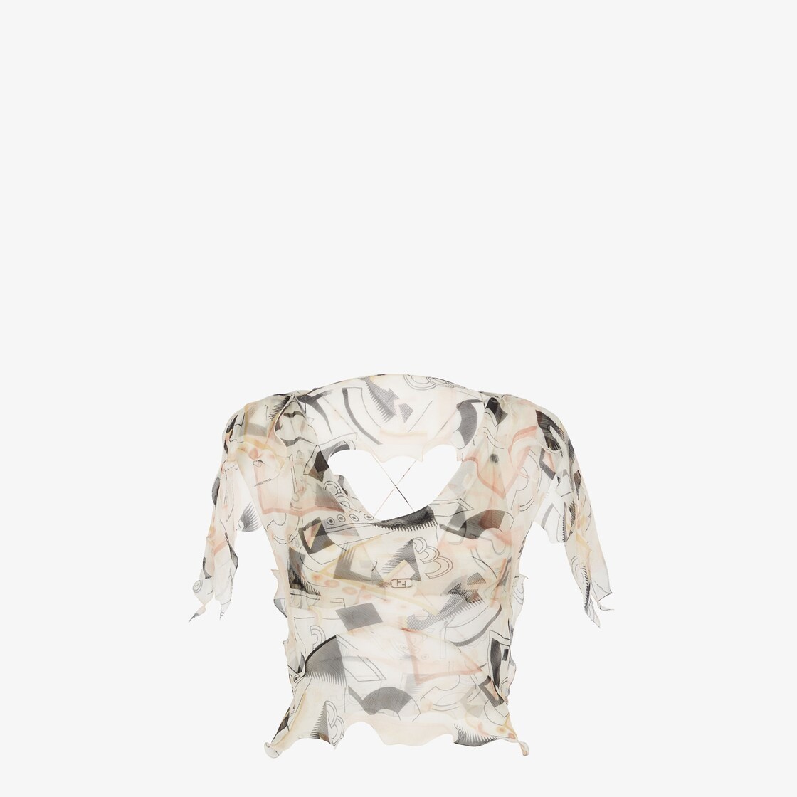 Cropped sleeveless top with shoulder cape. Wide neckline on the front and open back with crossed laces. Made of light pink silk chiffon with abstract geometric motif printed all over in a mix of shades. Finished with small, matching tone ruffles. Coordinated matching print bra. Made in Italy Composition: : 100% Silk, bra: 100% Viscose Model height: 178 cm Size worn: 38 IT Product Code: FS7563AKSNF1IHA