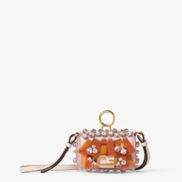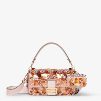 Nano version of the iconic Baguette bag, with flap and FF closure with magnetic clasp. The clip allows it to be attached to larger bags or belts. It can also be carried under the arm or by hand thanks to the slender adjustable, detachable shoulder strap. Credit card holder flat pocket inside. Made of light pink satin, decorated with three-dimensional embroidery consisting of sequins, crystals and sculptural-effect mirror appliques in different contrasting colors. Pink elaphe details and shoulder strap. Gold-finish metalware. Made in Italy Composition: 45% viscose, 38% polyester, 17% silk, embroidery: 45% glass, 40% polyester, 15% metal, 100% colubro leather, inside: 45% viscose, 38% polyester, 17% silk Product Code: 7AS413AYCKF1TWX