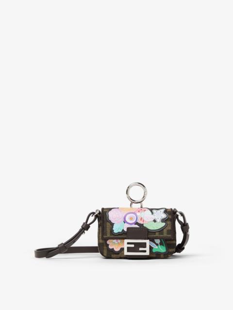 Iconic Nano Baguette bag, with flap and FF clasp with snap button. The clip allows it to be attached like a charm to larger bags or belts. Can also be worn cross-body thanks to the slender adjustable, detachable chain shoulder strap. Credit card holder flat pocket inside. Embroidered all-over with multicolor sequins for a faded effect. Details and shoulder strap in burgundy calfskin. Gold-finish metalware. Made in Italy Composition: 100% polyester, embroidery 1: 100% polyamide, 100% calfskin, inside: 100% sheepskin Product Code: 7AS413AW6SF1UZC