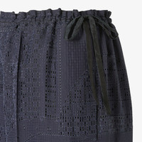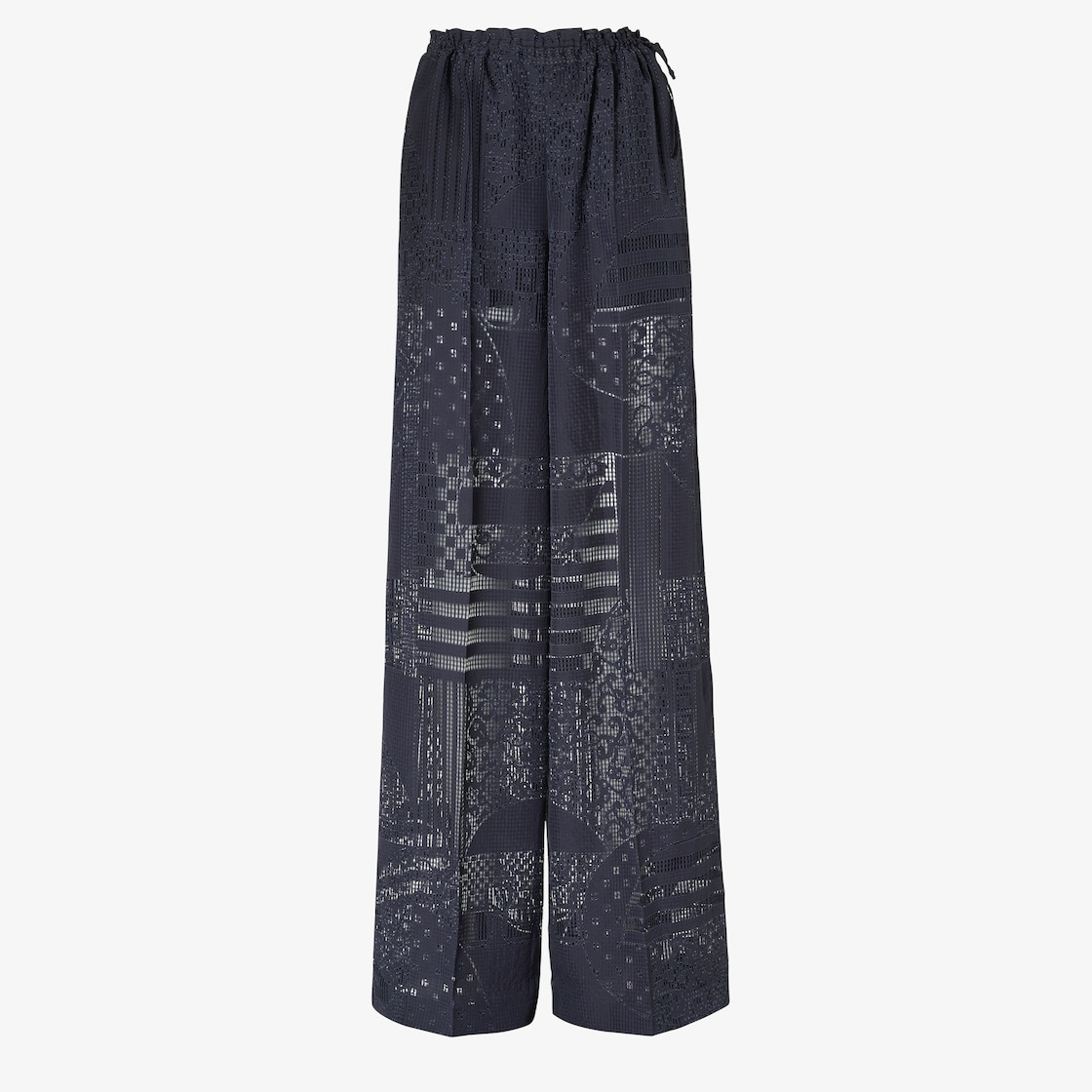 Straight-cut pajama pants with drawstring waist with ribbons to tie at the sides. Leg crease and side pockets. Half-lined. Made of blue viscose and silk with a burnout patchwork motif that depicts a combination of logos and archive patterns. Made in Italy Composition: 100% viscose, 100% silk Product Code: FR6646AUJXF0QB0
